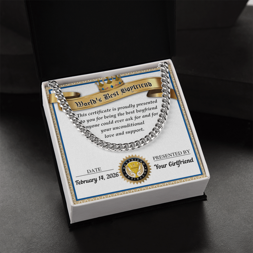 World's Best Boyfriend Cuban Chain Necklace – Personalized Certificate Gift from Girlfriend